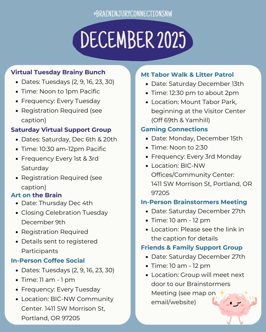 Have questions or need more info? Reach out to us at braininjuryconnectionsnw@bic- nw.org or call (503) 208-4533. Canβt wait to see you at these incredible events !